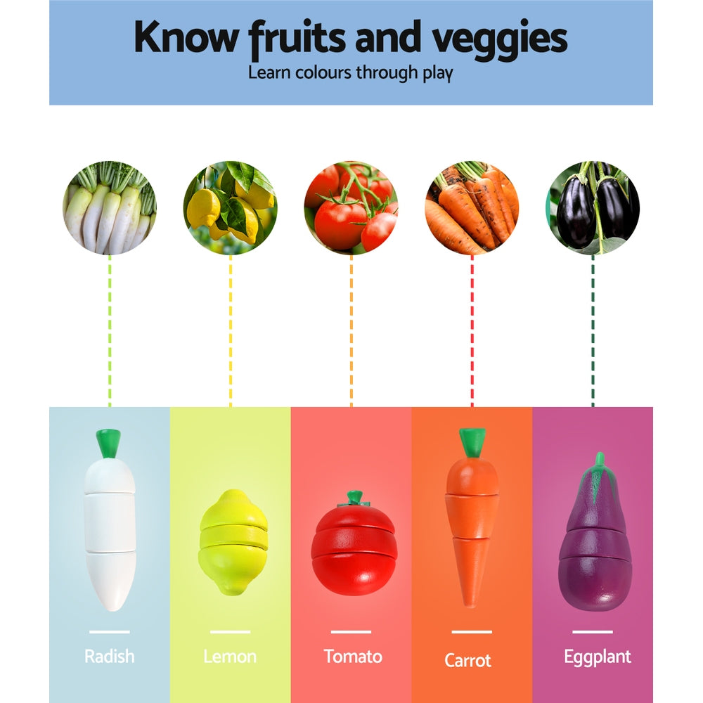 Comprising a 29-piece playset of fruits, vegetables and kitchenware, this colourful set lets your child pretend-slice fruits and vegetables, arrange table settings, clean up and store, and role play as a cook as well. The "cut" vegetables and fruits are cleverly held together by magnets for easy and realistic pretend-slicing and starting all over again for repeated plays.